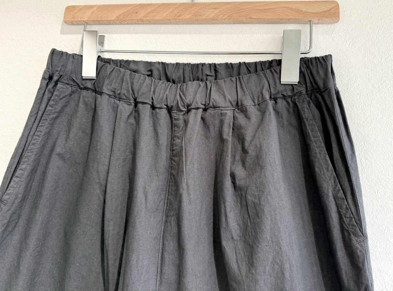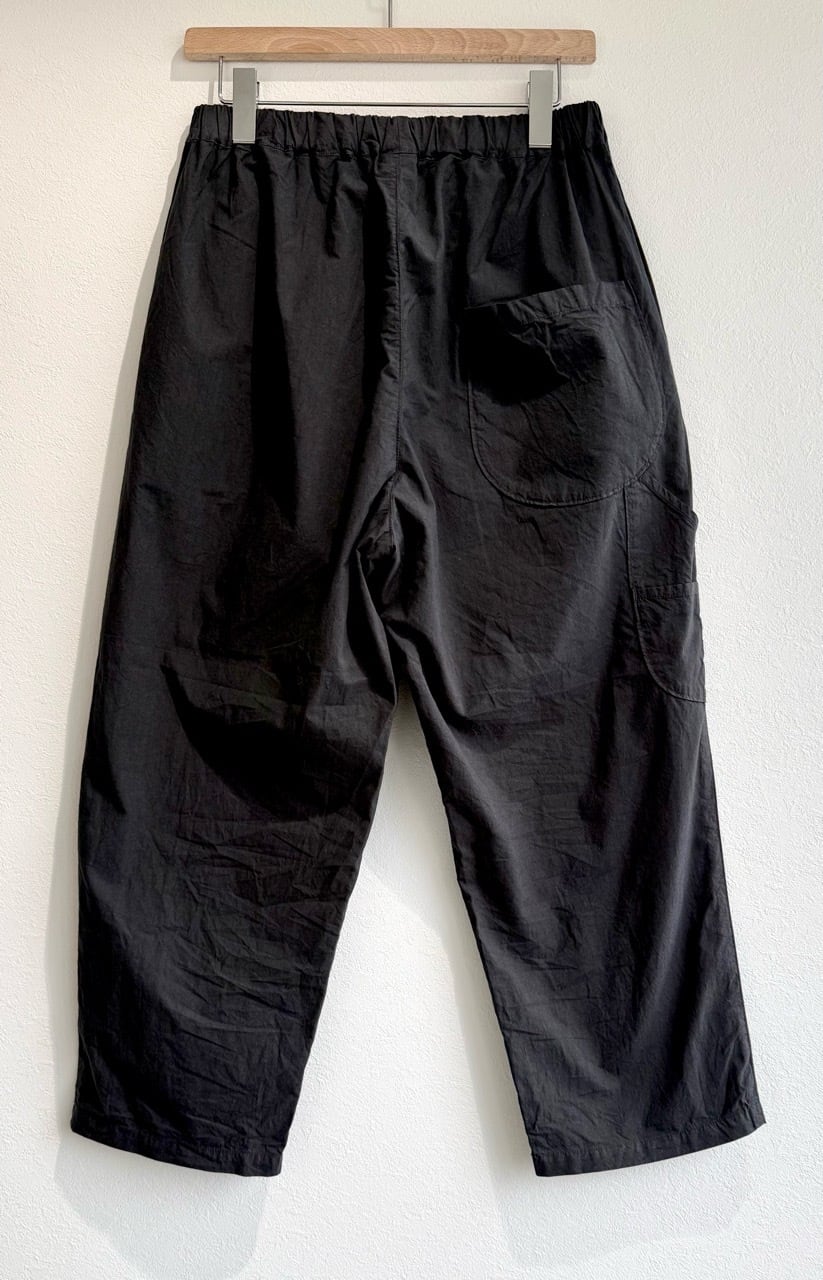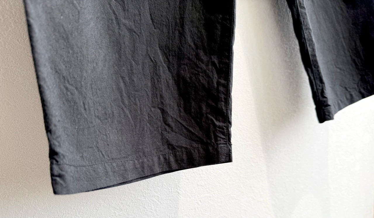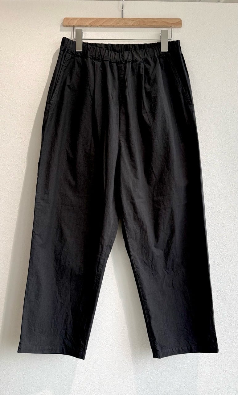 ダンプ素材を用いたクロップド丈のややゆったりとした製品染めイージーパンツ。