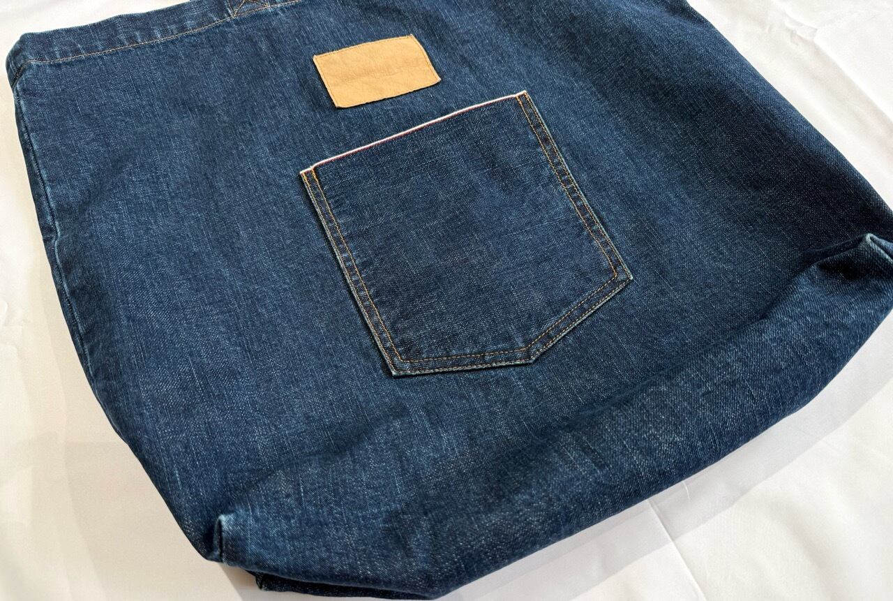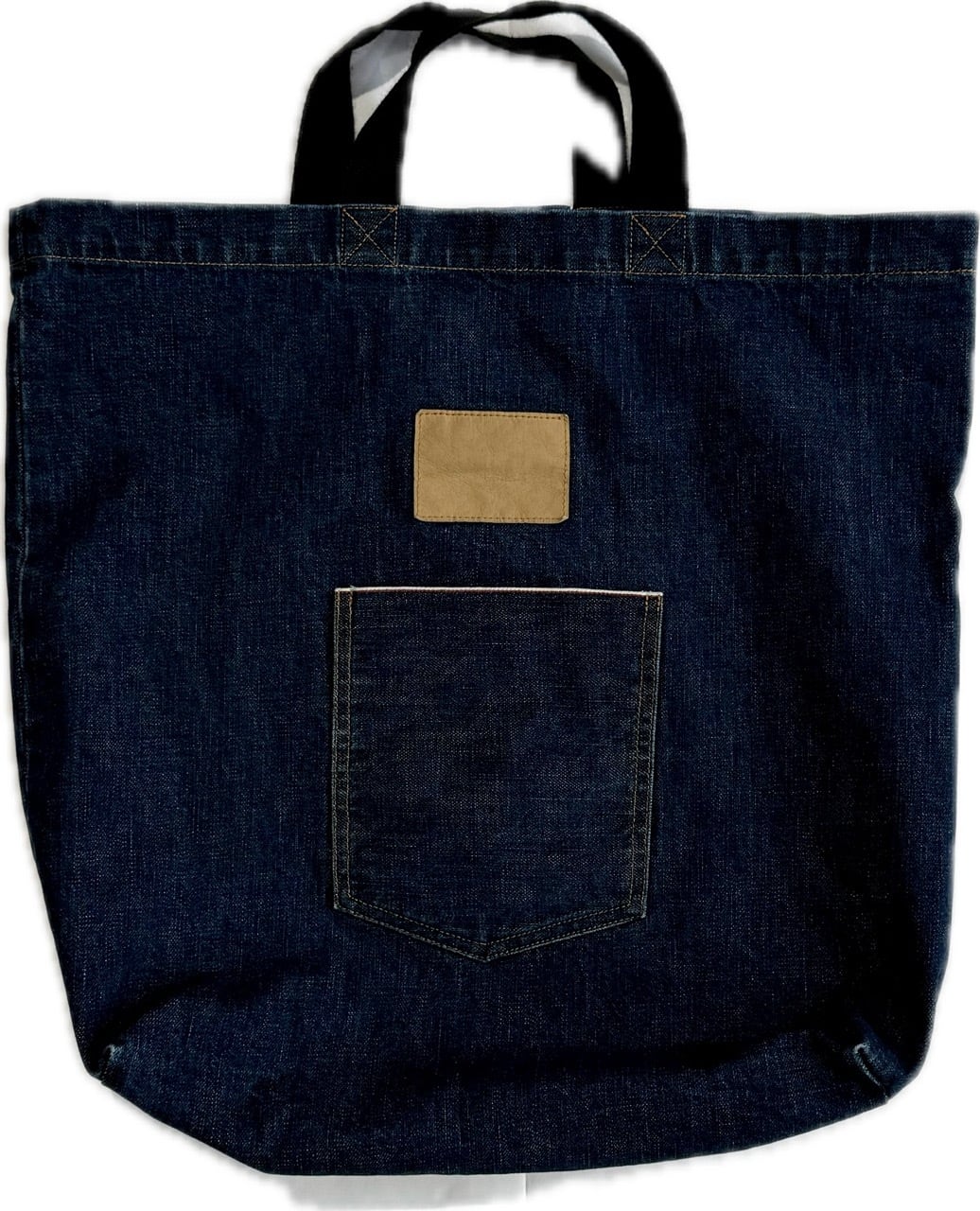 定番デニムに翔しているセルヴィッチデニム生地の残反を有効活用して作ったトートバッグ。